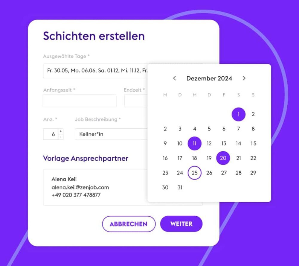 In der Plattform finden Sie alles an einem Ort, was Sie für die Personalbuchung und Verwaltung benötigen, damit Sie mit möglichst wenig Aufwand Unterstützung bekommen. Neben der Erstellung von Schichten können Sie die Besetzung in Echtzeit verfolgen, die Schichtzeiten der Zenjobber bestätigen und deren Unterstützung bewerten. Außerdem können Sie Ihre Schichten bei Bedarf stornieren oder die Anzahl der benötigten Aushilfen editieren.